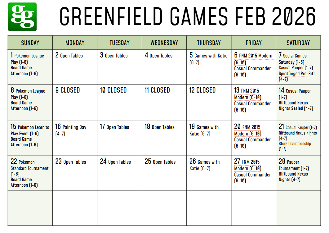 - Saturday February 28th: Monthly Pauper Tournament! 1:00-5:00. Entry fee will be $5 and will include standard credit prizes!