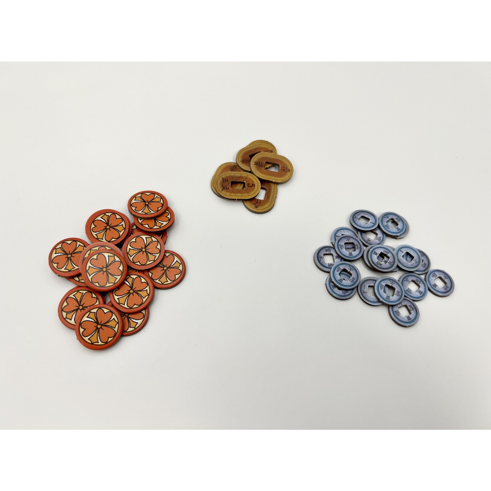 The central panel shows Himeji Castle in all its splendor, divided into several zones. The largest is inside the castle, with the Room of the Thousand Carpets, where the courtiers must ascend socially until they reach the circle closest to the Daimyo to enjoy his favor. There is also the pond and the gardens, patiently tended by the gardeners where everyone can relax and contemplate its beauty without restriction. Another important area is the wall and the outside of the castle, where the warriors patrol and stand guard. Finally, we find the area of the three bridges, where the three types of dice that can be used to carry out actions are accumulated, and the personal domain of each player, where they will keep track of their resources and where they will have the reserve of workers.
